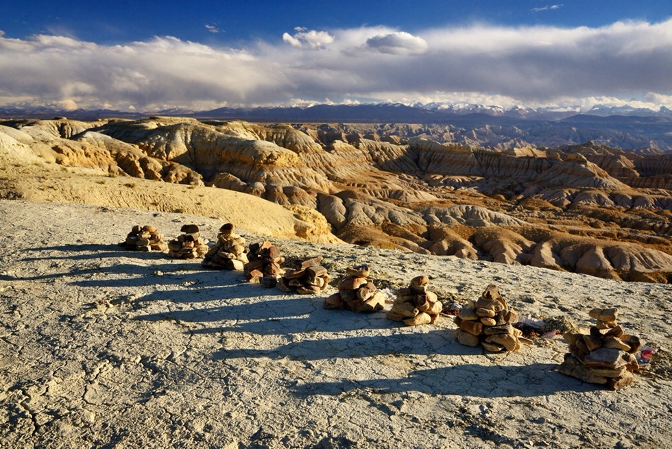 早上普兰科迦寺拍摄,午餐后上车我们前往札达。沿途从不同角度拍摄纳木那尼峰和神山冈仁波齐,到门士乡,我们将去最为神秘原始的莲花生寺。为什么我们莲花生寺呢?因为转完冈仁波齐一定还要到这里转经,这才算圆满。拍摄寺庙南侧长200米的“莲花生玛尼墙”,寺庙背后的山坡上到处都是神秘的洞空和祭台和寺庙附近带有神秘宗教色彩的五色土以及寺庙周围转经的人们。拍摄完之后再门士午餐,之后经巴尔兵站翻越阿伊日居拉山,拍摄珍珠湖,喜玛拉雅雪山下连绵上百公里的扎达土林奇观,傍晚拍摄去东嘎皮央拍摄夕照下的扎达土林日落。晚上县城住宿,有热水洗澡。(阿里是印度教、耆那教、西藏苯教、佛教等尊为“圣灵之所在”的“世界中心”。 扎达作为“阿里三围”之一的古格王国所在地,自然也是朝圣者必会朝拜的地方之一。)