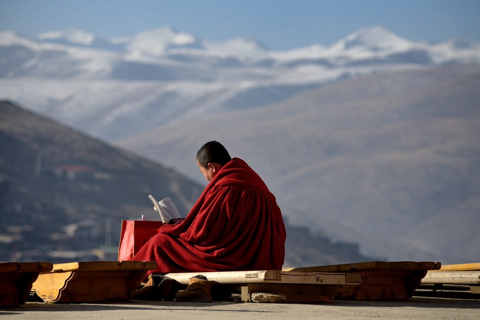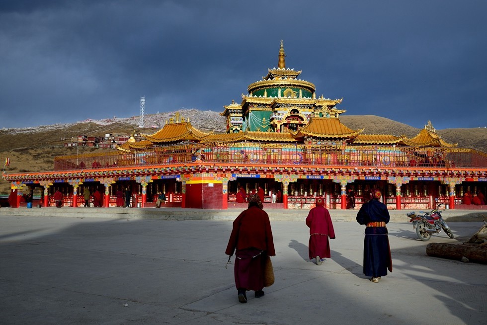 每当清晨太阳升起,一幢幢红色的小木屋在阳光下显得异常肃穆,无数灰白的小路连接着僧舍,纵横交错,晨光和炊烟升起,在光影变幻下十分壮观。坛城边永远都是川流不息的转经人,还有一排排磕长头的信徒,他们的虔诚与专注将让你震撼无比。