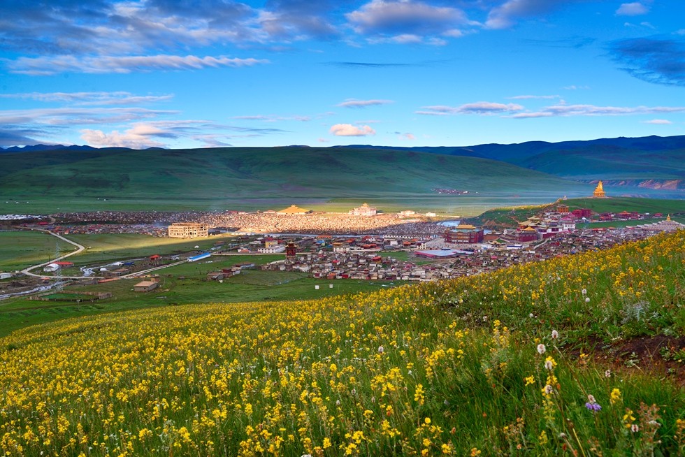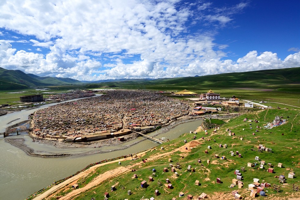 亚青寺位于川西甘孜州白玉县沙鲁里雪山下,海拔3600米以上,属藏传佛教宁玛派。亚青寺建在草原湿地之上,这里修行的僧尼达数万人,周边圈是密密麻麻的木屋僧舍,纵横交错的河流包围了整个寺庙的建筑群。每当清晨或黄昏,炊烟弥漫,河水闪耀着粼粼的金光,恍如世外桃源。